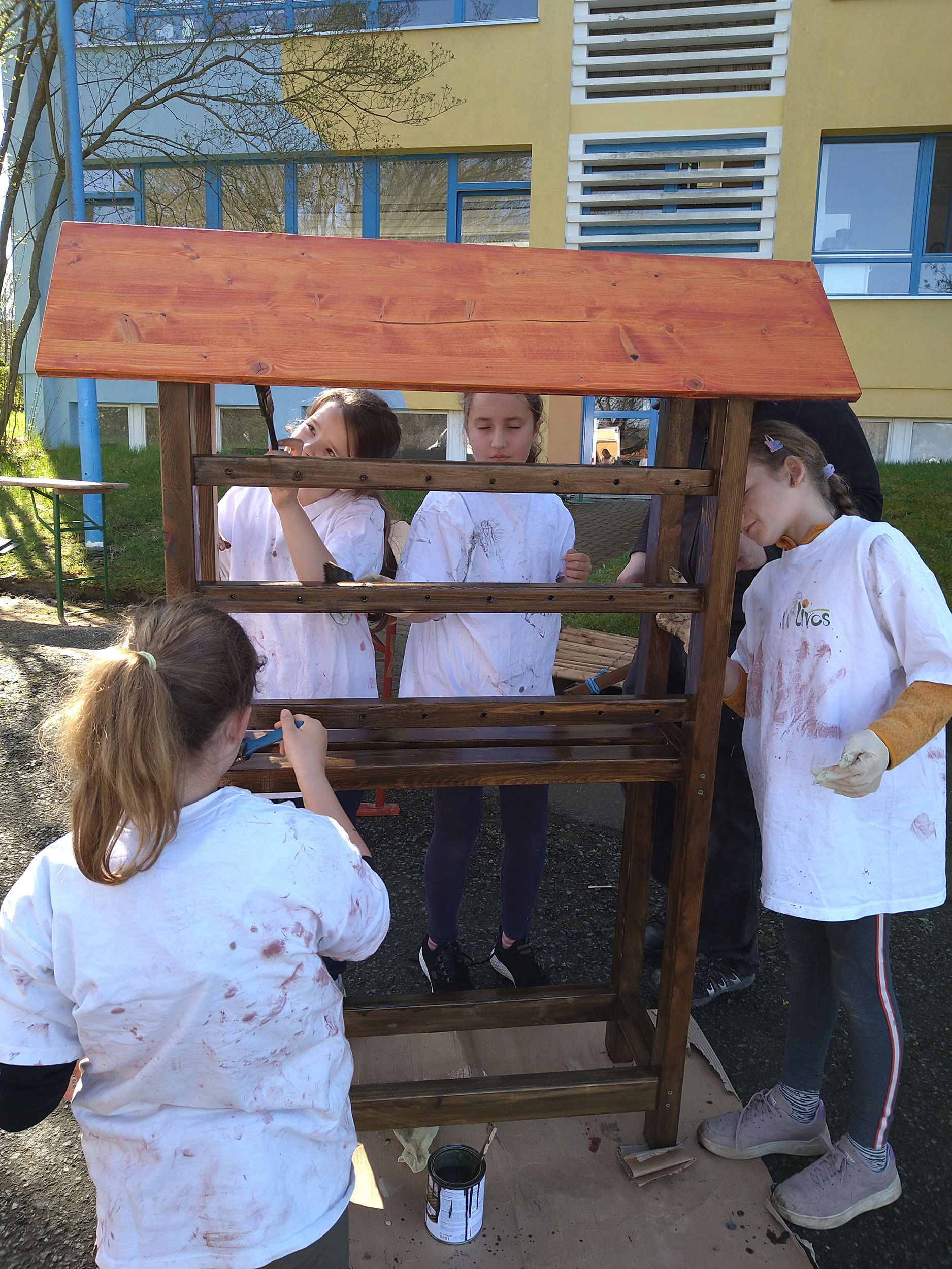 In den vier Stunden konnten die jungen Baumeister sogar das Gerüst des Insektenhotels anstreichen. Die einzelnen Module mussten noch trocknen, doch am 30. April 2025 war es dann soweit: Das fertige Insektenhotel wurde aufgestellt – ein tolles Gemeinschaftsprojekt, das nun den Schulgeländebereichert. Das beigefügte Foto zeigt den stolzen Moment mit dem fertigen Bauwerk.